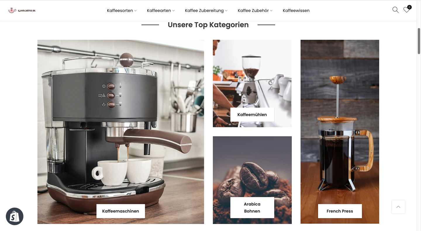 Shopify Amazon Affiliate Shop mit Produkten und Informationen rund um das Thema Kaffee.